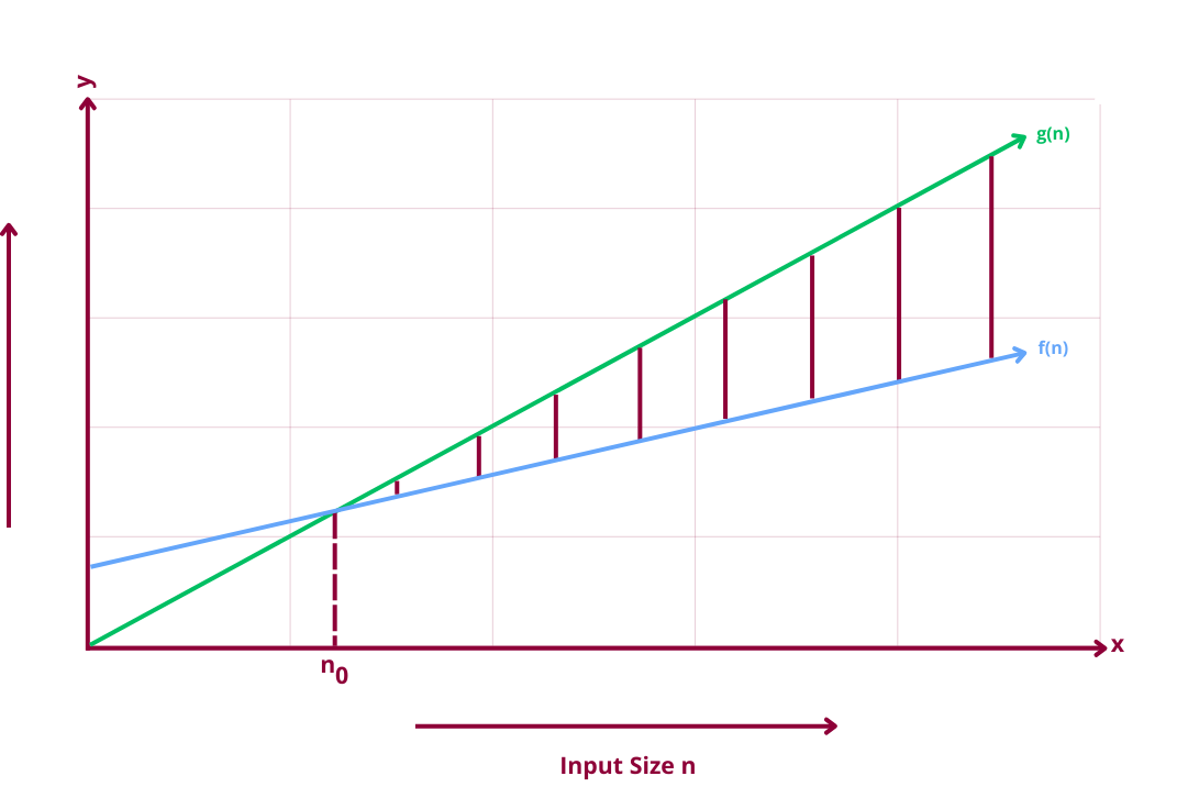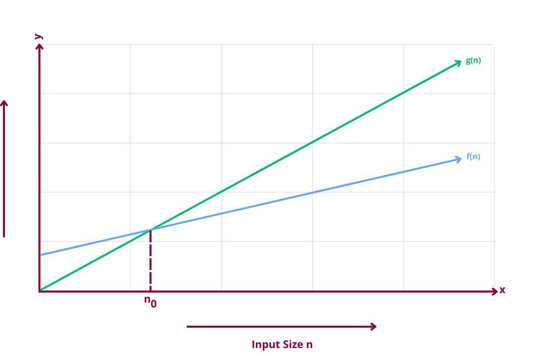 Big O notation says that for any point after n0 the function f(n) will always be ≤ g(n) for larger values approaching ∞. If this condition holds true then we say that f(n)=o(g(n)). Before n0 though the values of both functions can fluctuate.