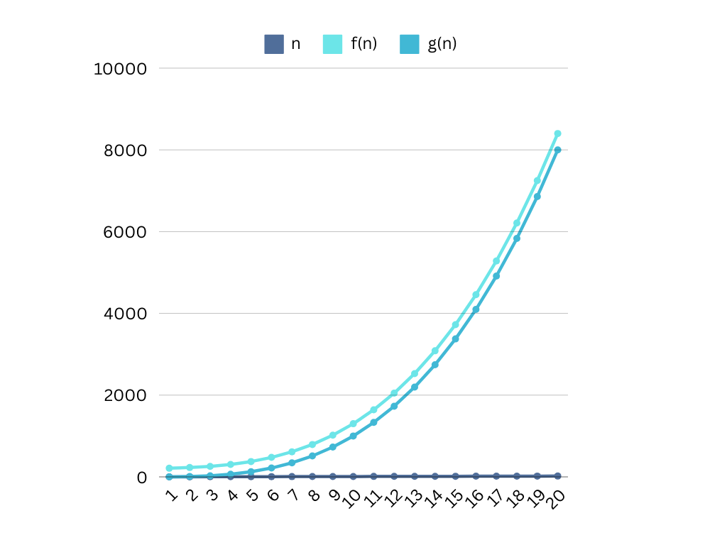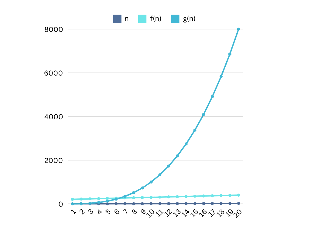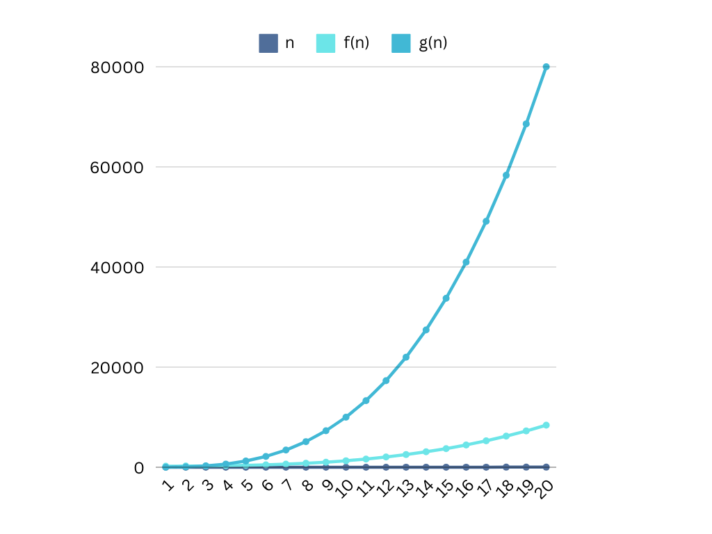 We are going to compare these two functions on the basis of their rate of growth. For this we are going to use Big O notation. Let's graph both f(n) and g(n). This is what we get:
