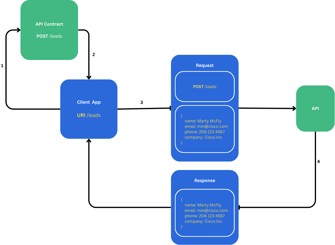 In order for the client to consume the API to create a new Sales Lead, the client must know in advance how the API contract is structured. From this the client can learn how to invoke the API, the request payload to send and the response to expect (1). The client can then implement the code changes on their side to consume the API (2 and 3) and a response is then returned back to the client (4).
