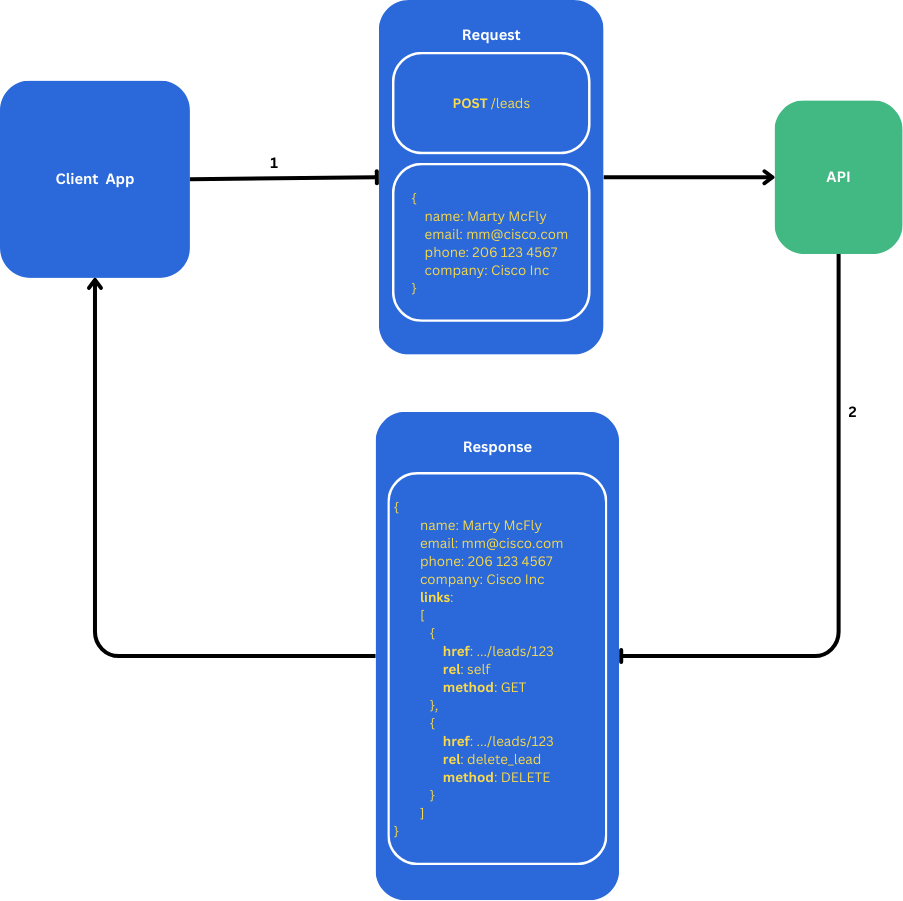 When the client consumes an API, the response returns a list of actions that are possible on that API. Going back to our API to create new Sales Leads, when the client consumes the API (1), the response returns a bunch of links that tell the consumer possible things that can be done with that resource (2). In this case the client can either get the Sales Lead's details or delete the Sales Lead.