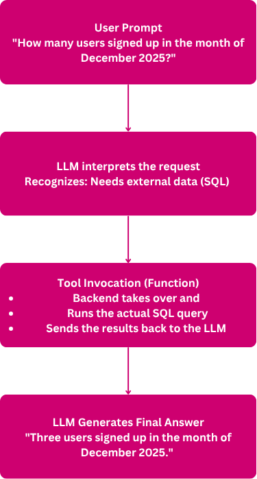 The LLM decides to use a database query tool or call a backend API - The tool formulates a query, such as: