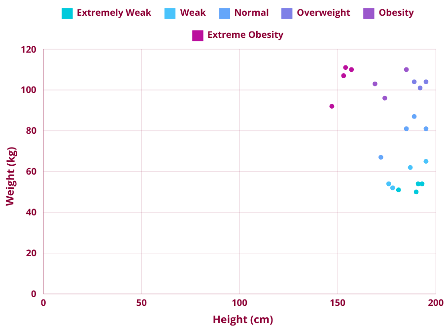 We will be calculating the distance using Euclidean distance and the value of K is 3. To make things easier to work with let's represent the data set as a table. Each person in the table is categorized into a BMI category of Extremely Weak, Weak, Normal, Overweight, Obesity and Extreme Obesity.