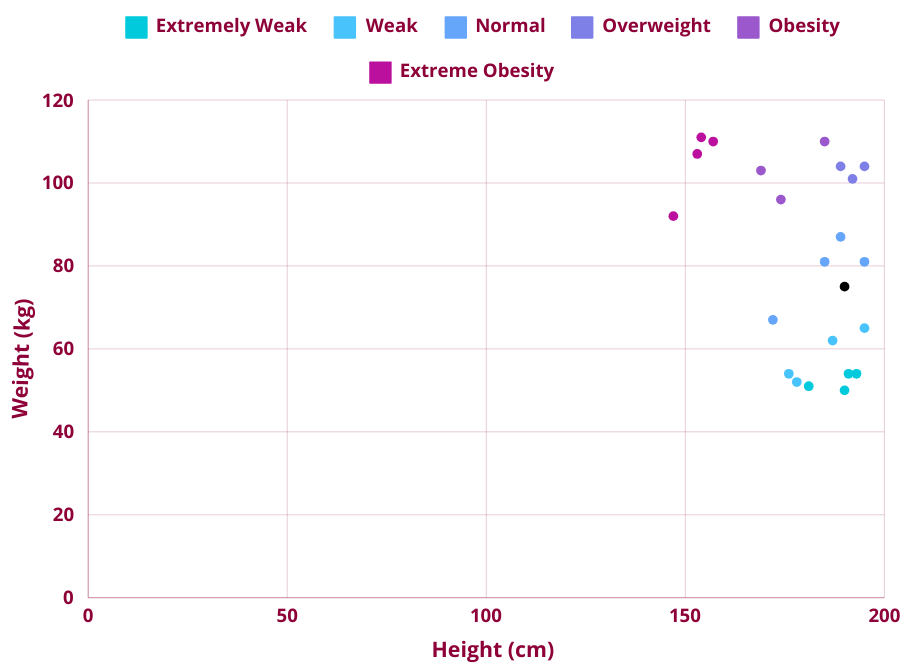 | 157 | 110 | Extreme Obesity | β[(190Β β 157)2 Β + (75Β β 110)2 ] = 48.10 |