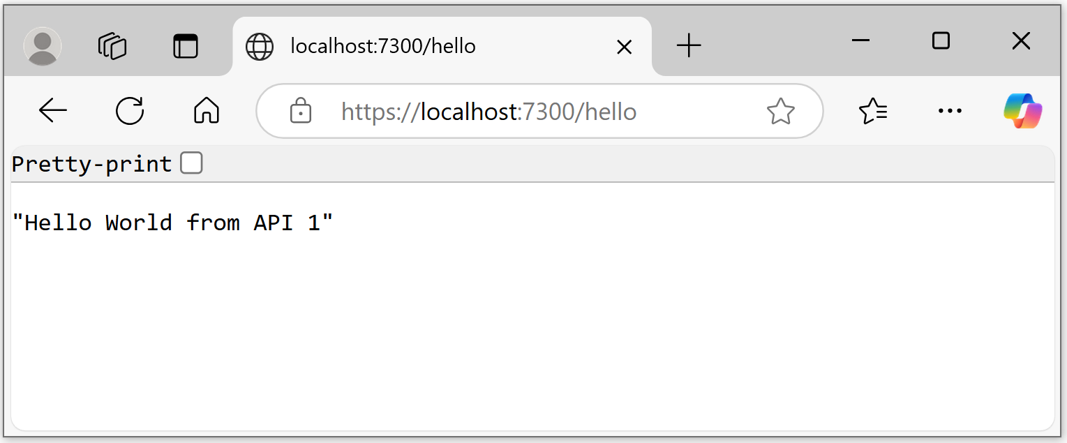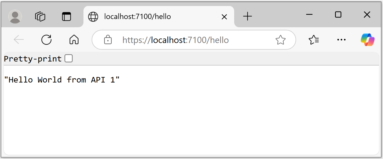 API 1 returns Hello World from API 1 when the GET request is invoked. The service is available on: https://localhost:7100/