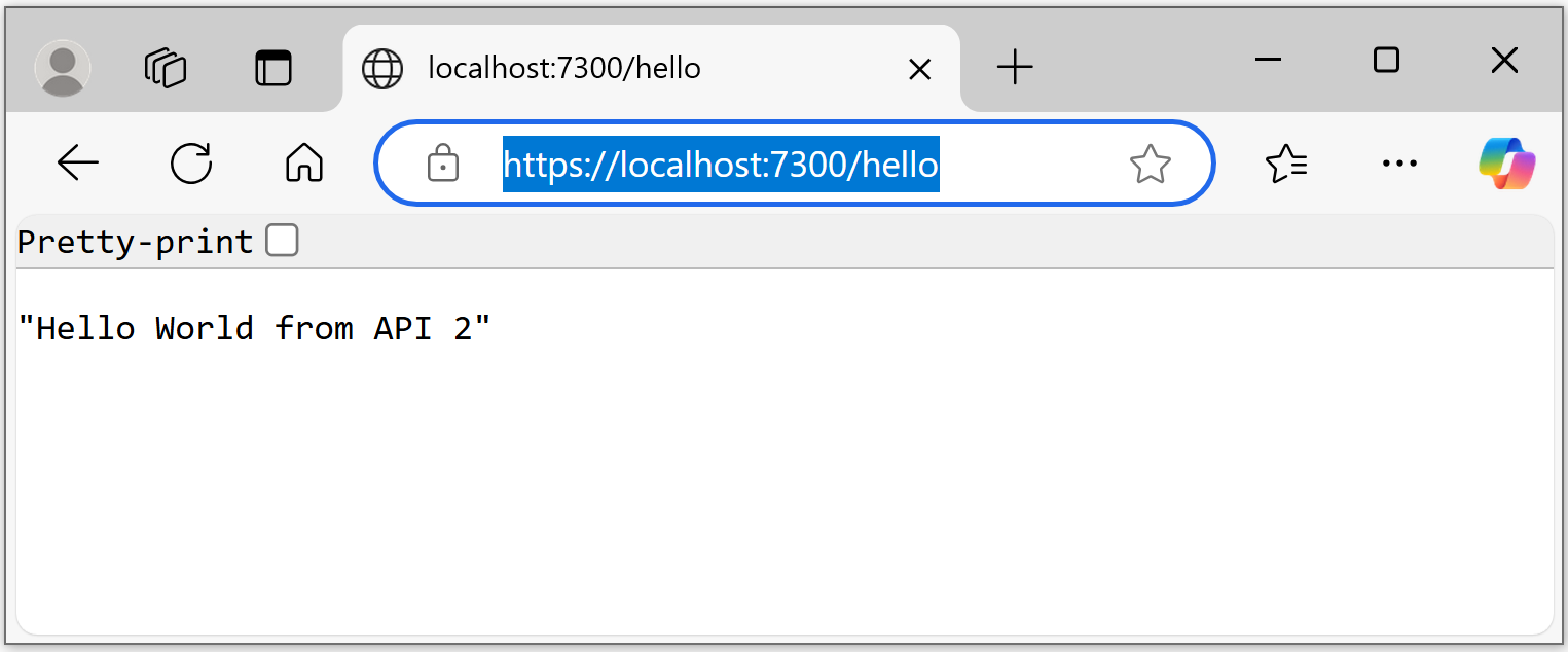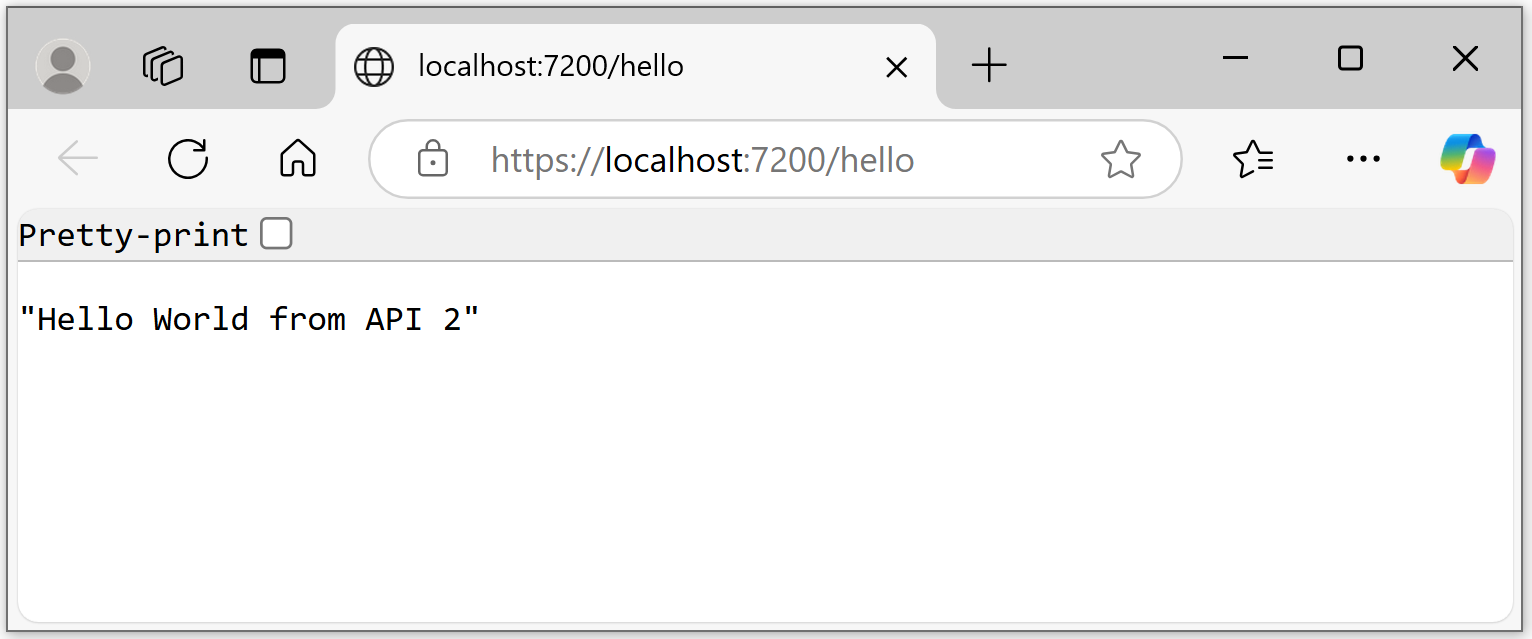 API 2 returns Hello World from API 2 when the GET request is invoked. The service is available on: https://localhost:7200/