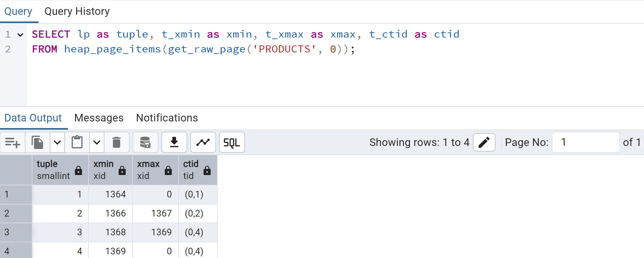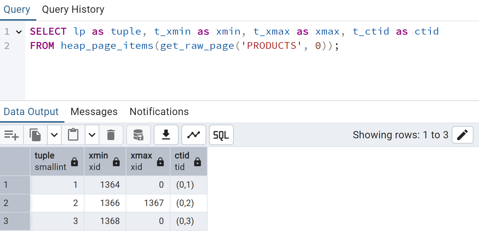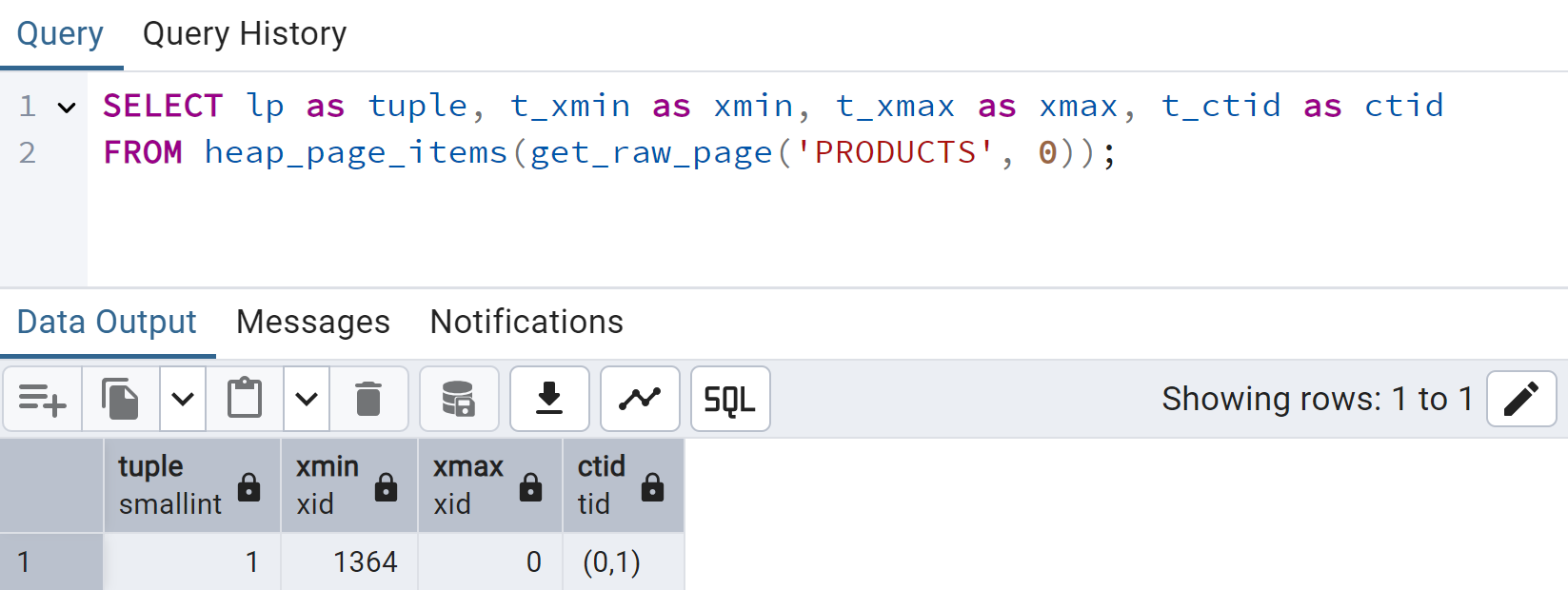 xmin is assigned a transaction ID of 1364.xmax is set to 0 (the row has not been deleted).ctid is set to point to the physical storage location.