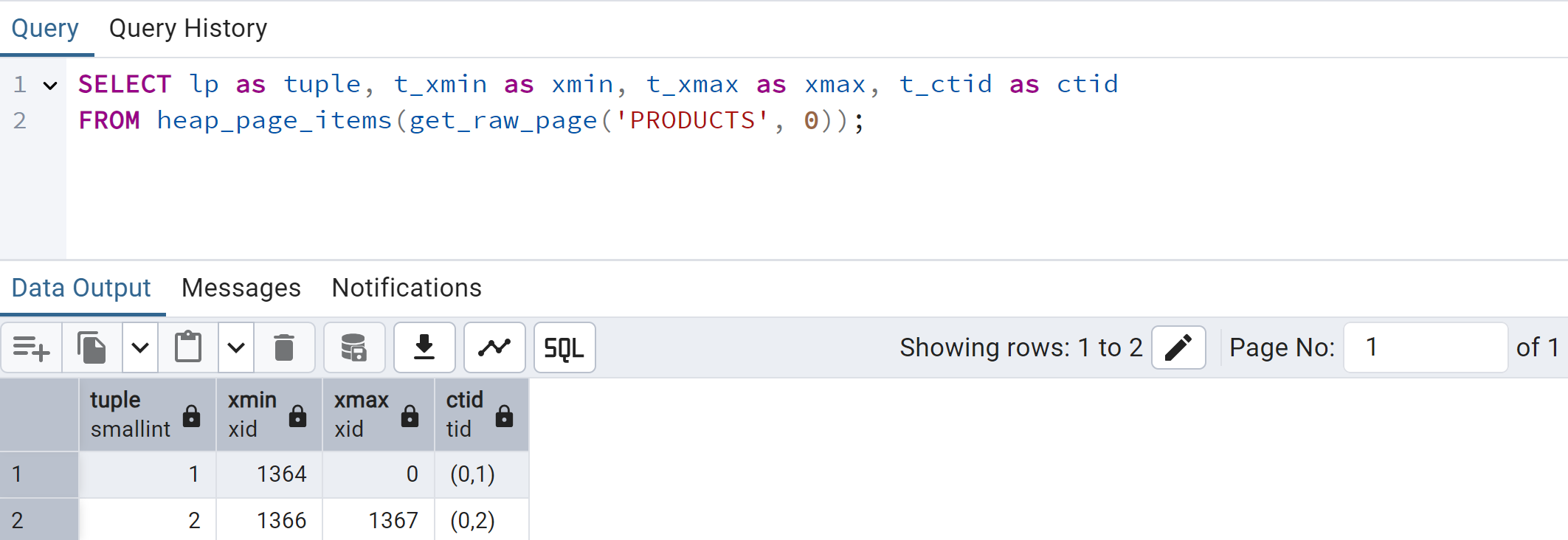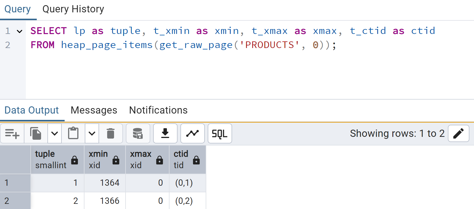 xmin is assigned a transaction ID of 1368.xmax is set to 0 (the row has not been deleted).ctid is set to point to the physical storage location.