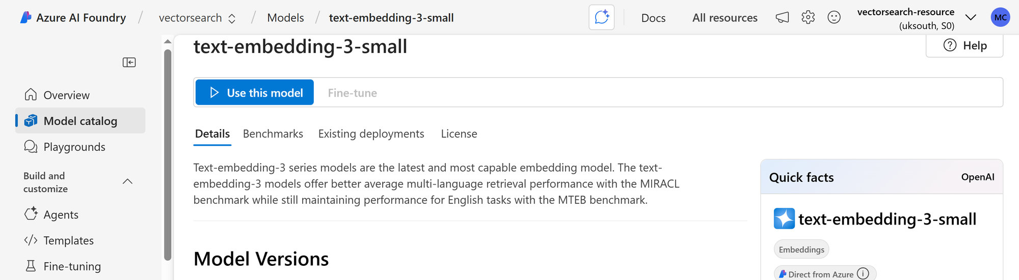 We'll leverage Azure AI Foundry, which offers a wide selection of pre-trained foundation models hosted on Azure. For our use case, we'll use text-embedding-3-small to convert movie descriptions into high-dimensional vector representations.