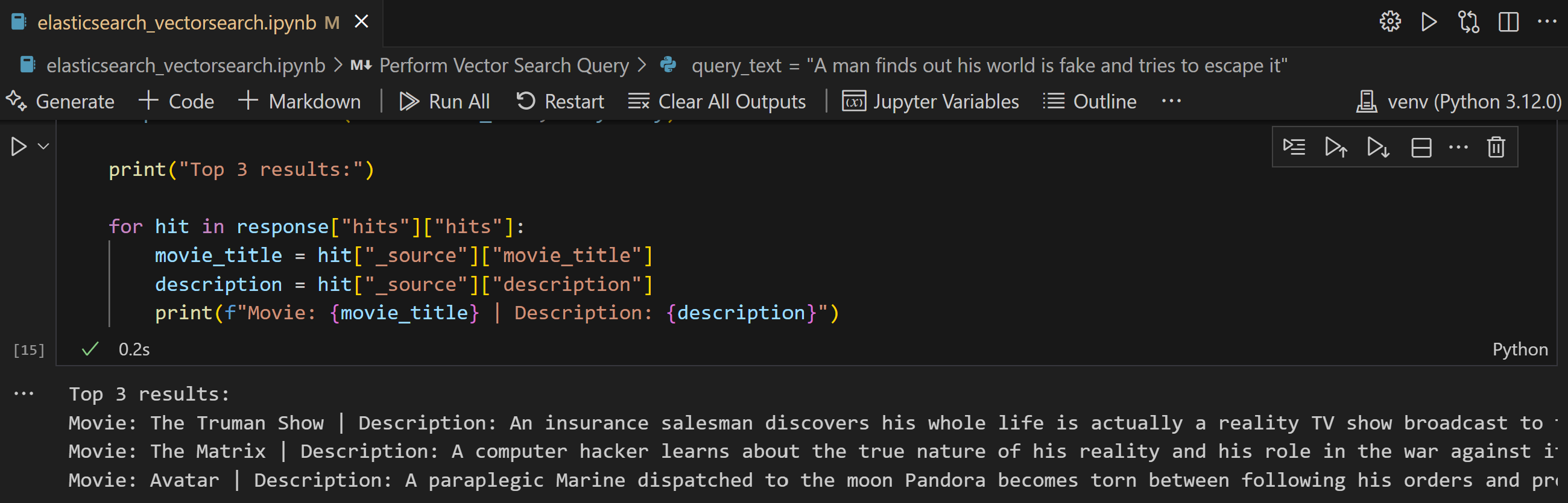 - Index the data: Store each movie's description and its vector embedding in Elasticsearch